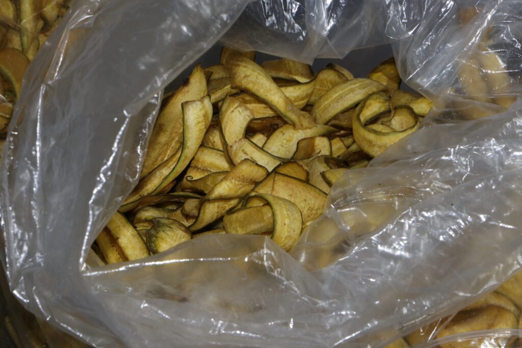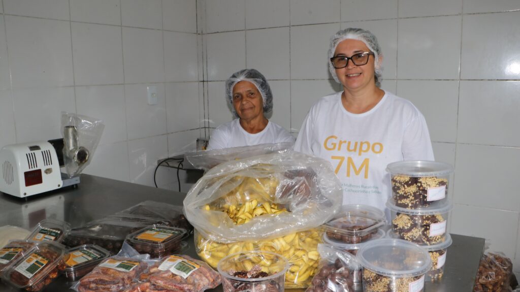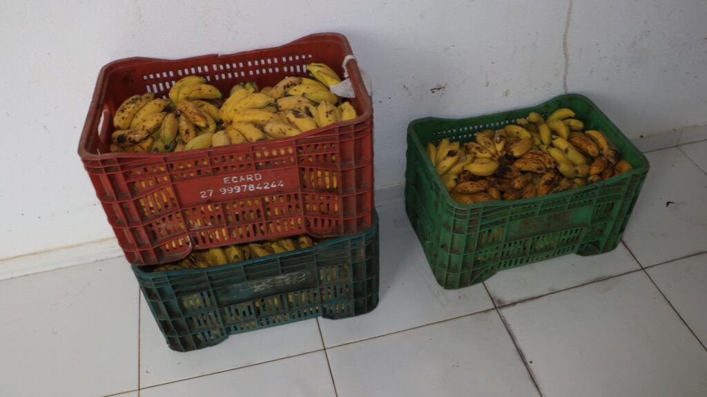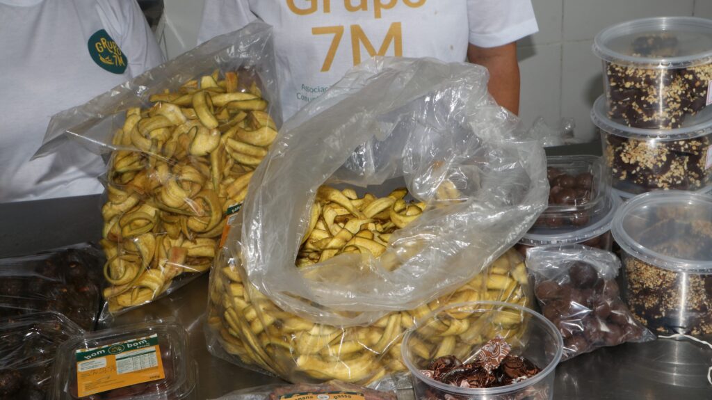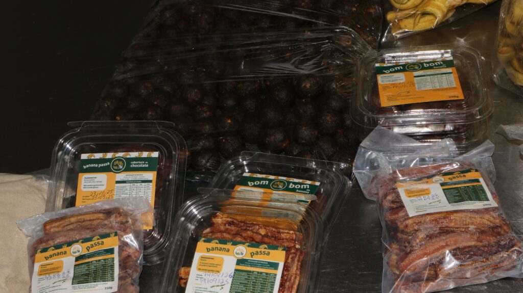 “Aqui, a lavoura mais abundante é a banana. O problema é que muita banana ficava perdida no ‘juntador’ [equipamento que facilita a aplicação de sacos em volta dos cachos de banana, chamado de embolsador], porque os atravessadores deixavam para trás. A gente então encontrou uma forma de aproveitar esse refugo que estava sendo jogado fora. Esse também foi um dos motivos que nos levaram a reunir pessoas e fazer um movimento para trabalhar esse produto”, completa Vera Monteiro.